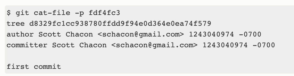 커밋 개체는 스냅샷에서 최상단 트리를 하나 가리키고, Author/Committer 정보, 시간, 커밋 메세지를 포함하게 된다.
