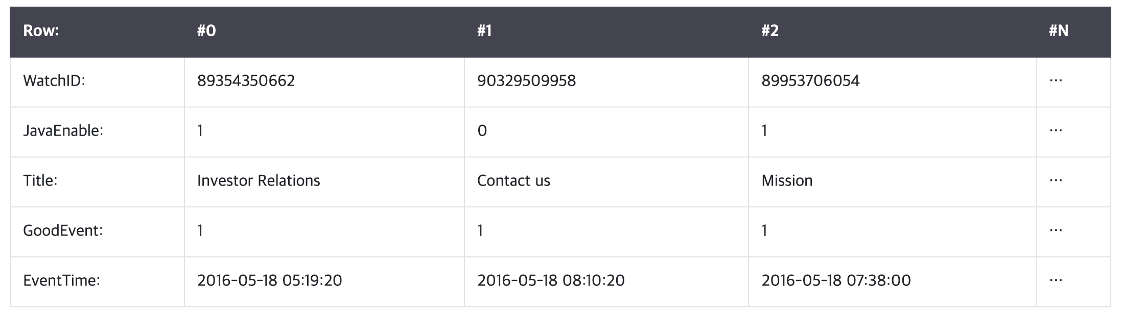 지금까지 주로 사용해왔던 MySQL이나 PostgreSQL, MSSQL 같은 DBMS는 row-oriented DBMS로, 데이터가 row 단위로 저장된다. 이 방식은 하나의 인스턴스에 다양한 property가 있는 형식으로, 한 row에 관련된 value는 물리적으로도 서로 옆에 저장된다.