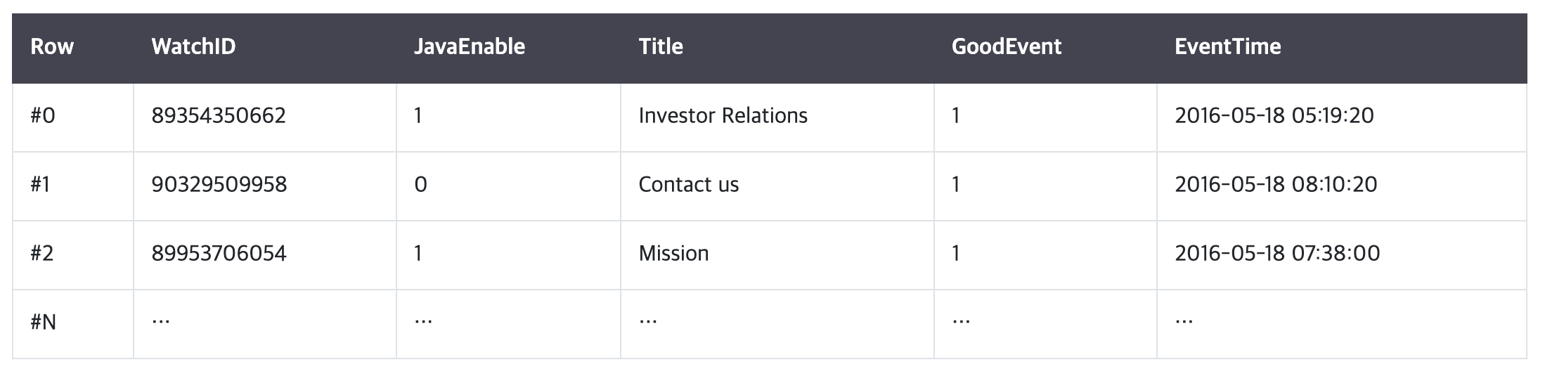 Clickhouse는 ClickStream 과 Data Warehouse가 합쳐진 이름으로, 기존에 사용하던 Row-oriented DBMS와 쿼리 문법이 유사하지만, 세부적인 부분에서는 다를 수 있다.