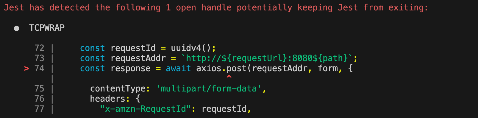 하지만 테스트 케이스를 추가하고, 응답시간이 오래 걸리는 케이스도 추가해 보니, Jest 부모 프로세스가 끝나더라도 응답이 오지 않는 경우도 있어서 다음과 같은 에러가 발생했다.